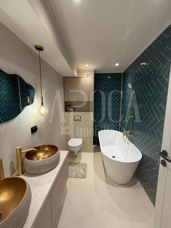 Locuinta dispune de finisaje moderne de inalta calitate, dintre care amintim parchetul laminat, gresia si faianta moderna, corpuri de iluminat LED, electrocasnice noi inca in garantie, mobilier de bucatarie realizat pe comanda, avand un design elegant si primitor.