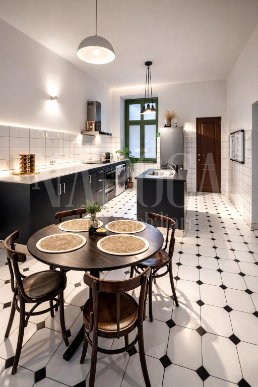 - gresie portelanata octogon si faianta minimalista in bucatarie;