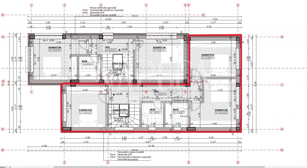 Etaj: dormitor matrimonial cu baie proprie, doua dormitoare si o baie.