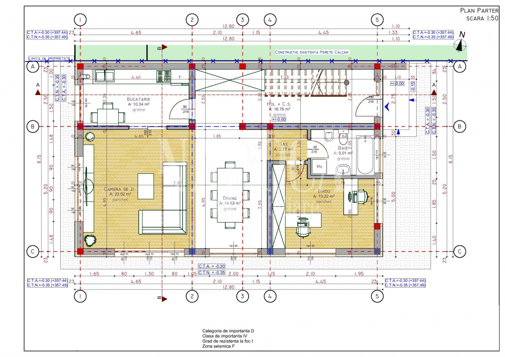 - Parter: 1 birou, 1 living cu loc de luat masa generos, bucatarie si baie.